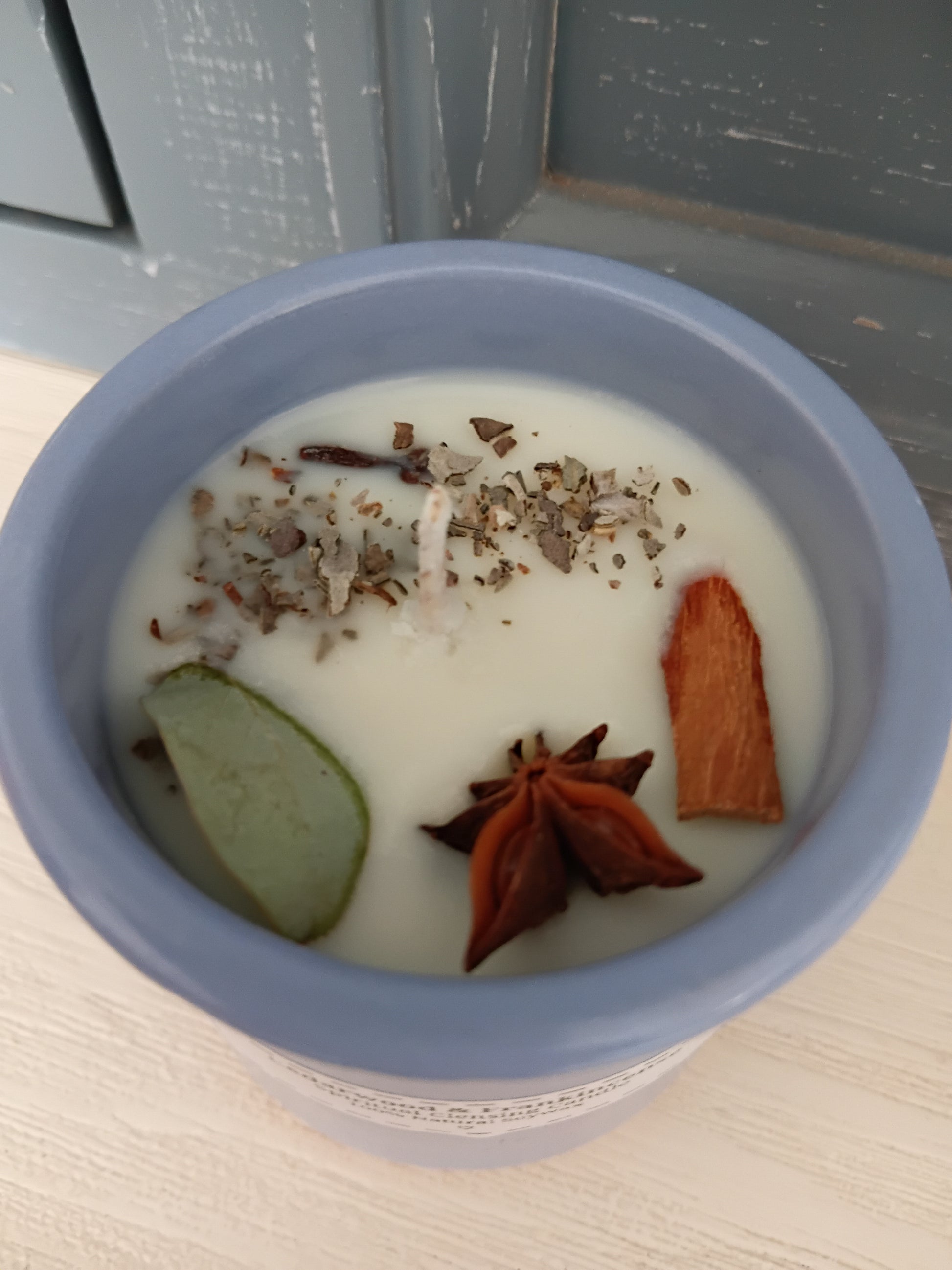 Made with 100% Natural Soywax, Cotton wick, Anise star, Cinnamon stick, Clove, Eucalyptus leaf & a sprinkle of White Sage.