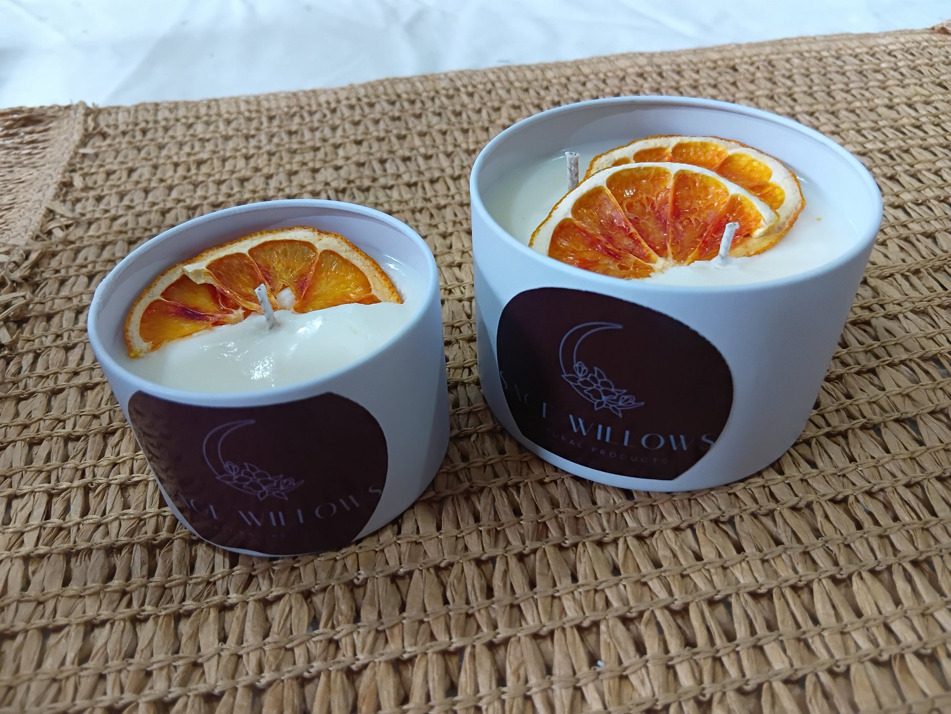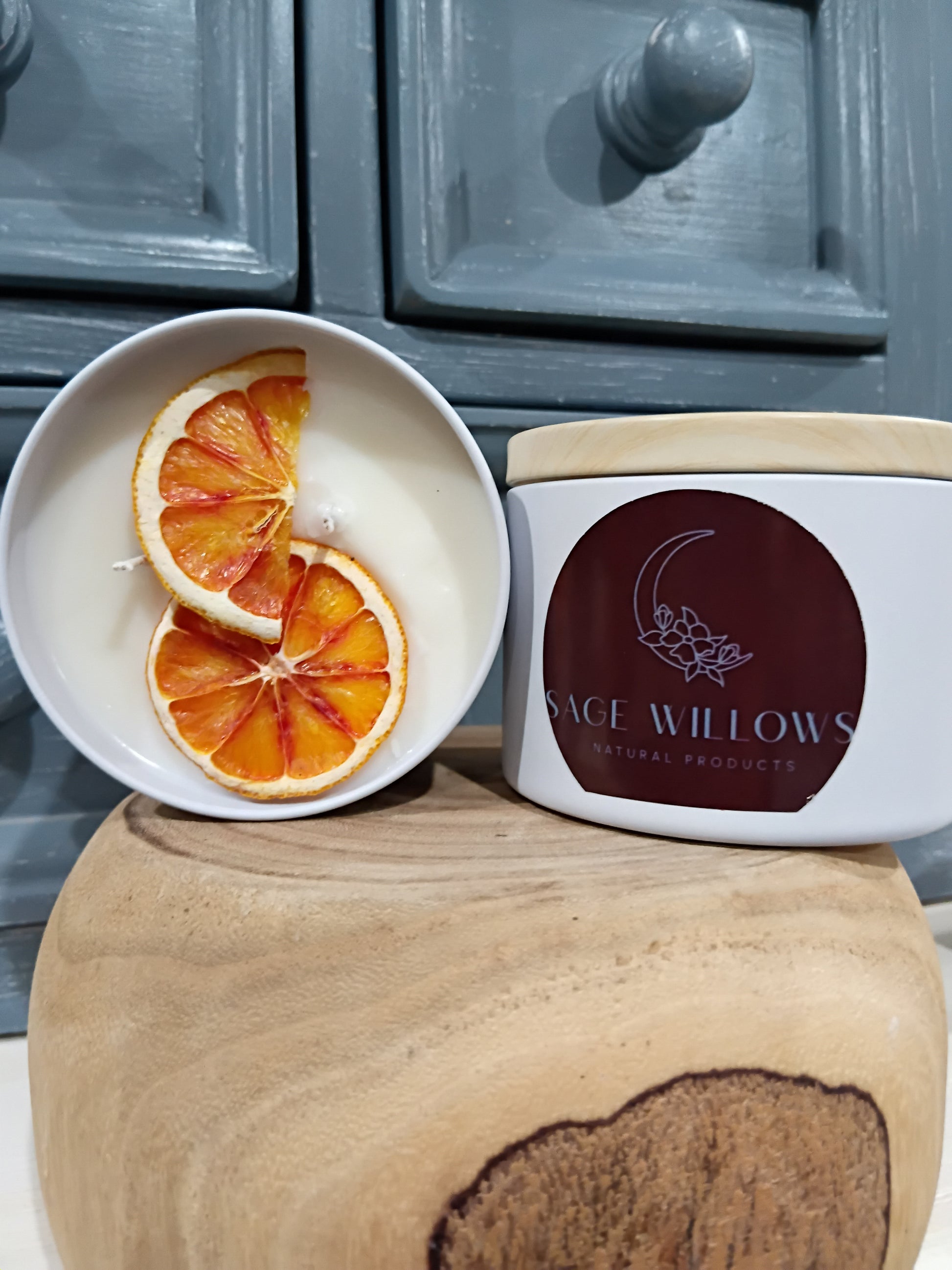 Gorgeous golden peach scented with added blood orange slices foraged, cleaned, sliced & dehydrated by me. 1 cotton wick.